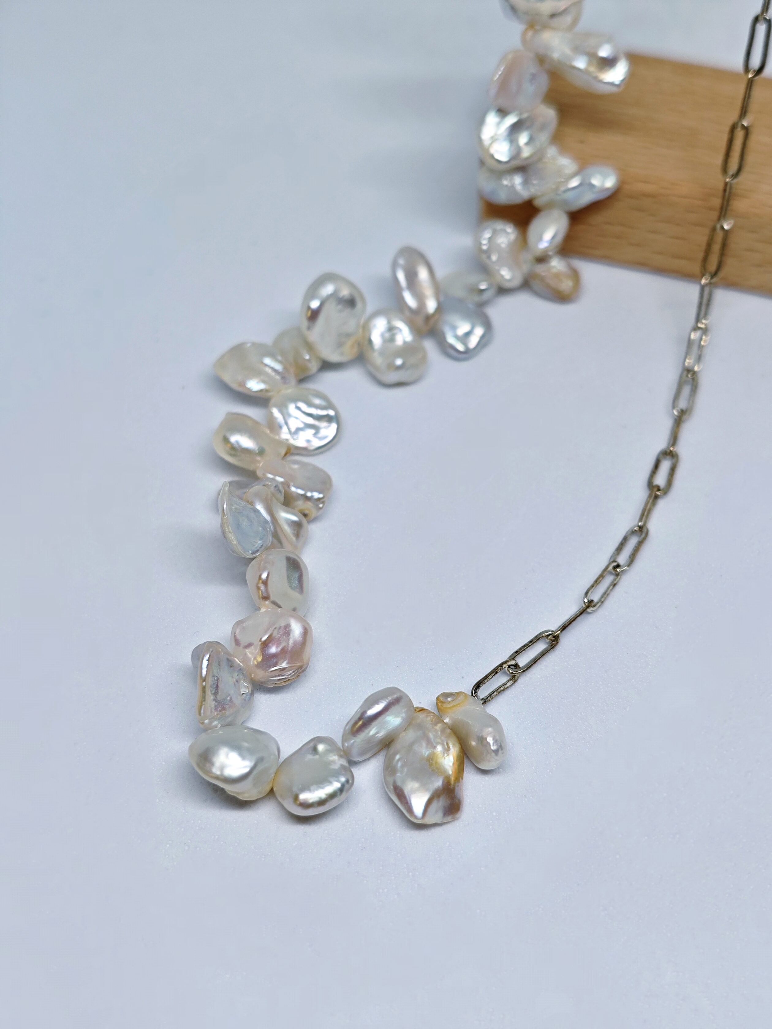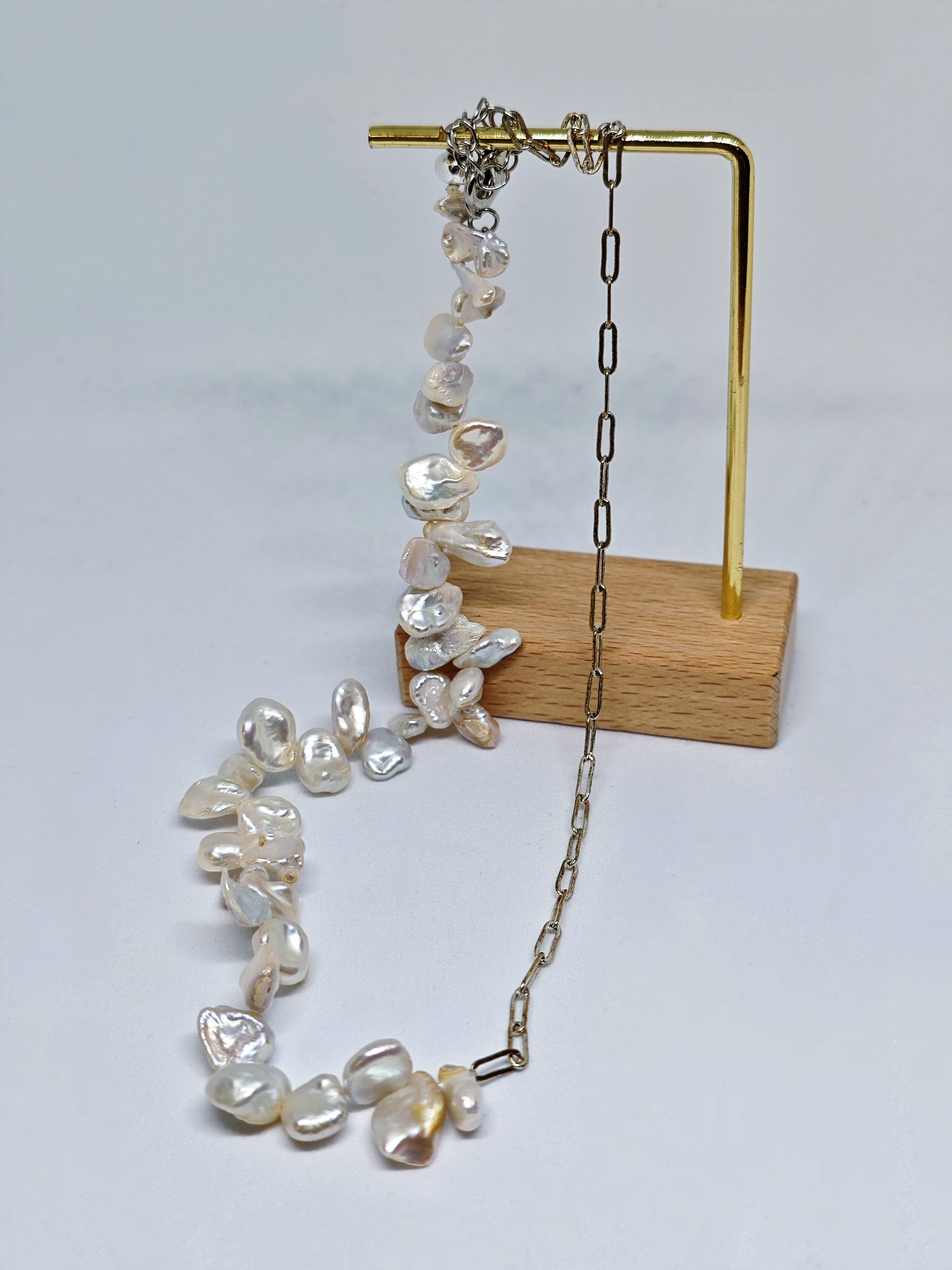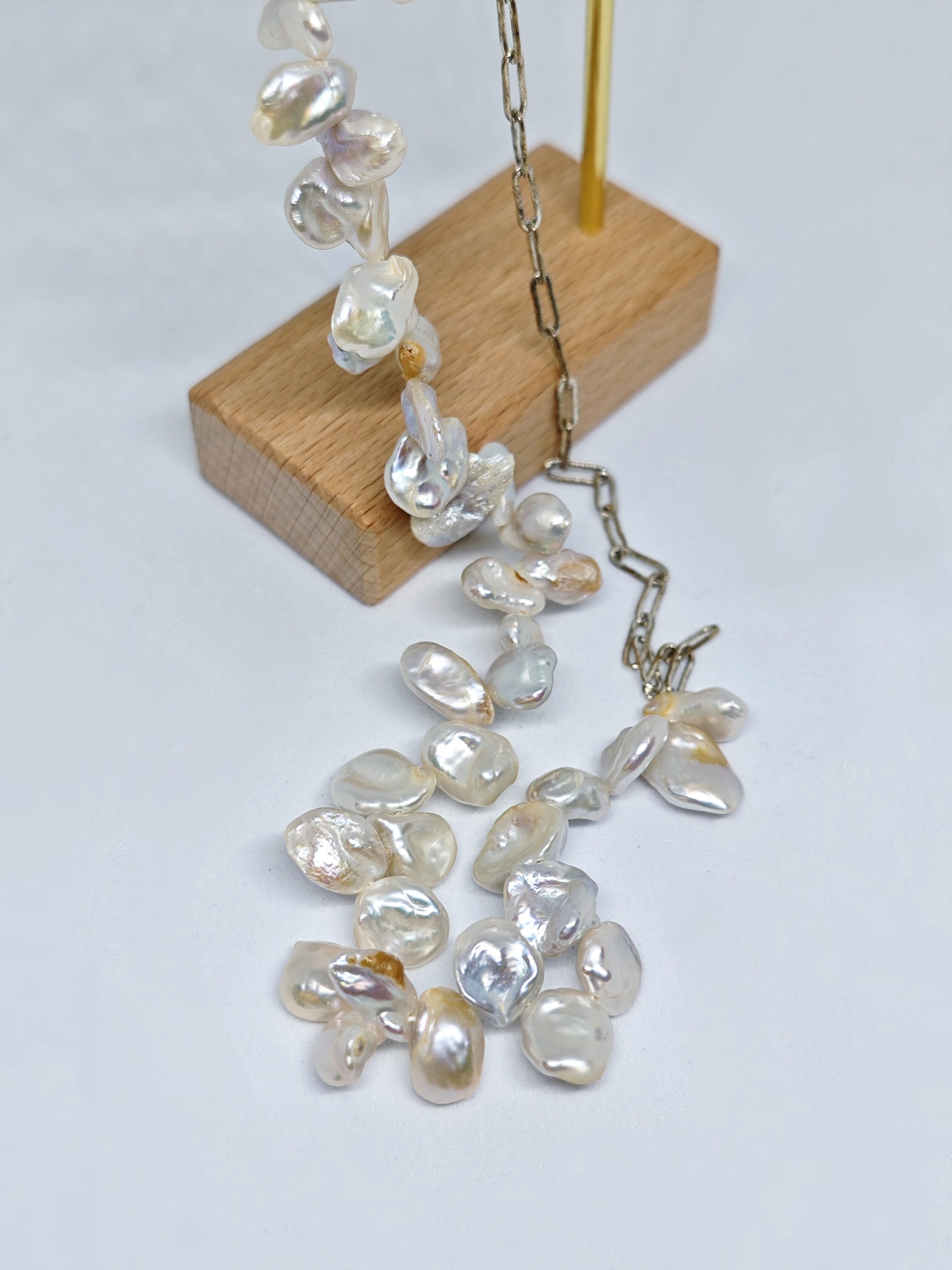 Featuring cultured pearls in irregular shapes and radiant natural luster, it pairs effortlessly with a minimalist metal chain to create striking visual contrast.