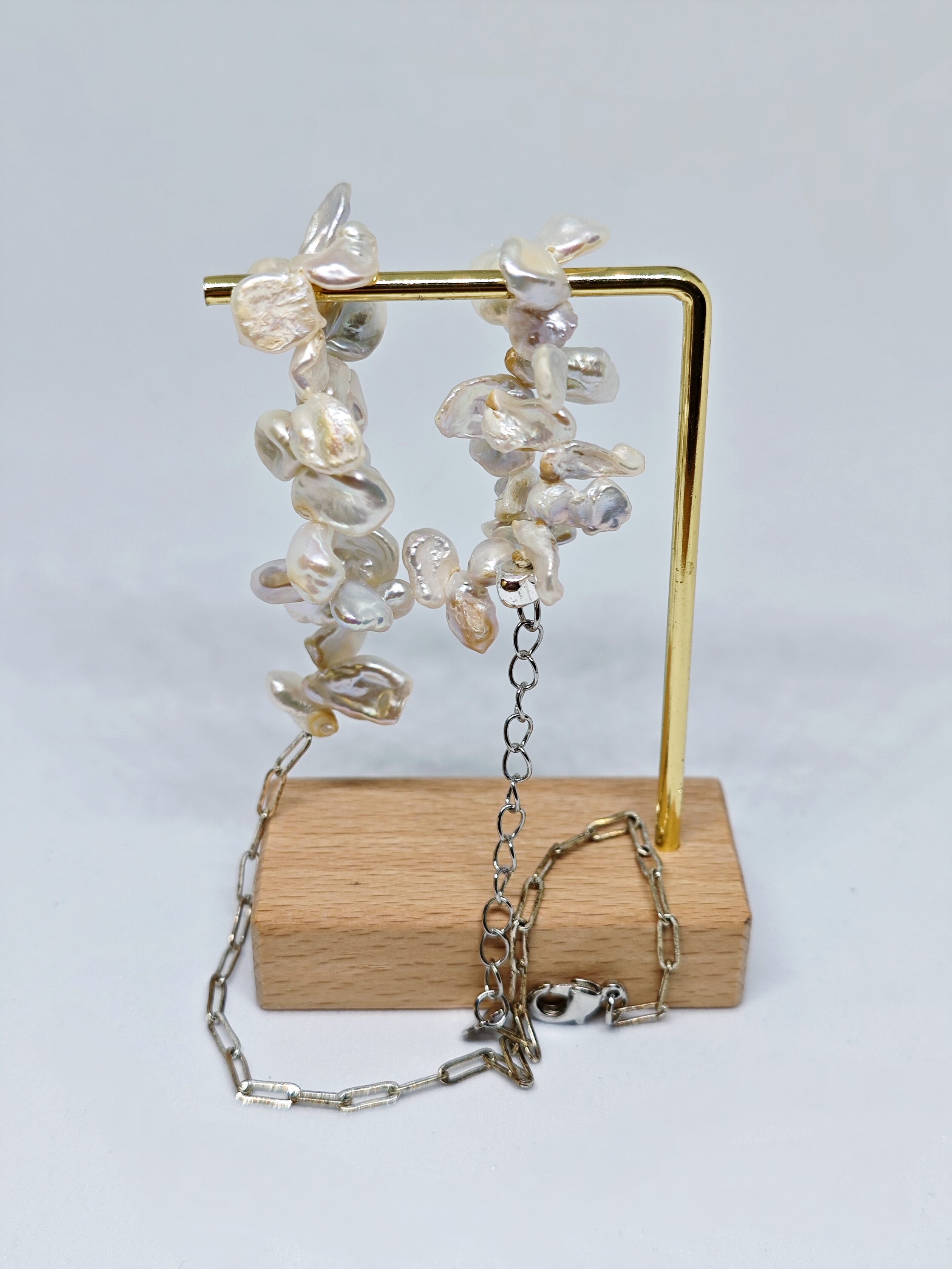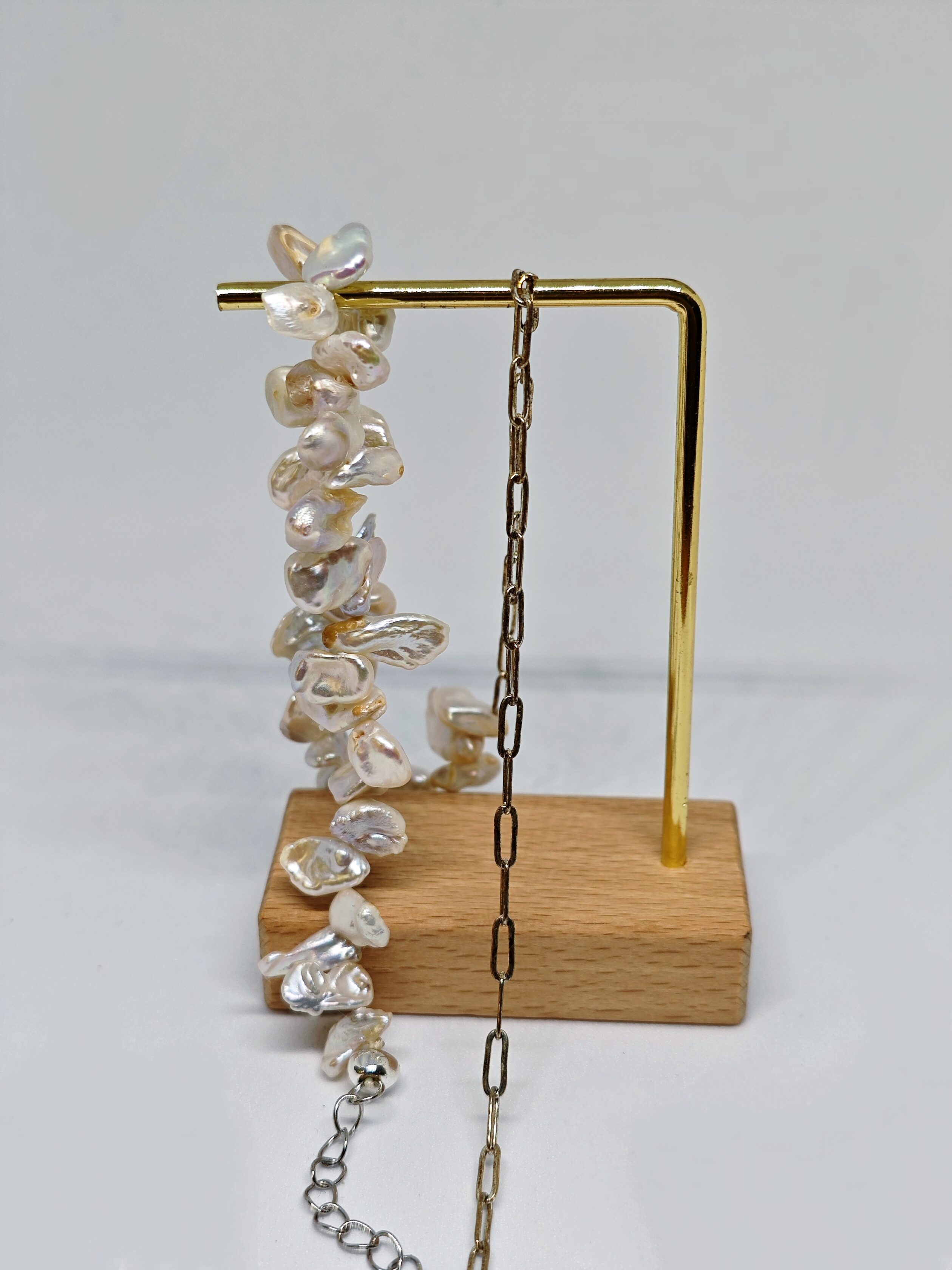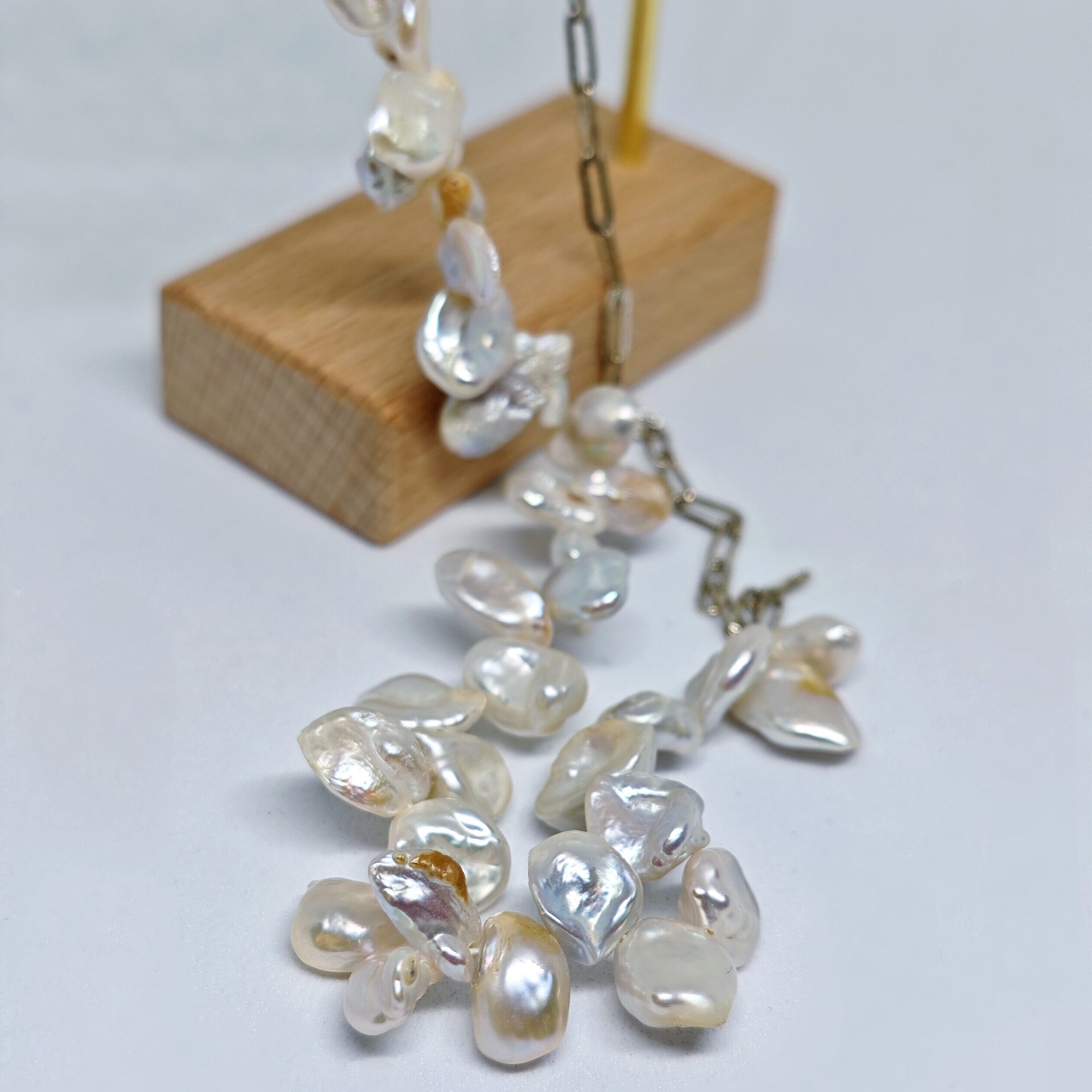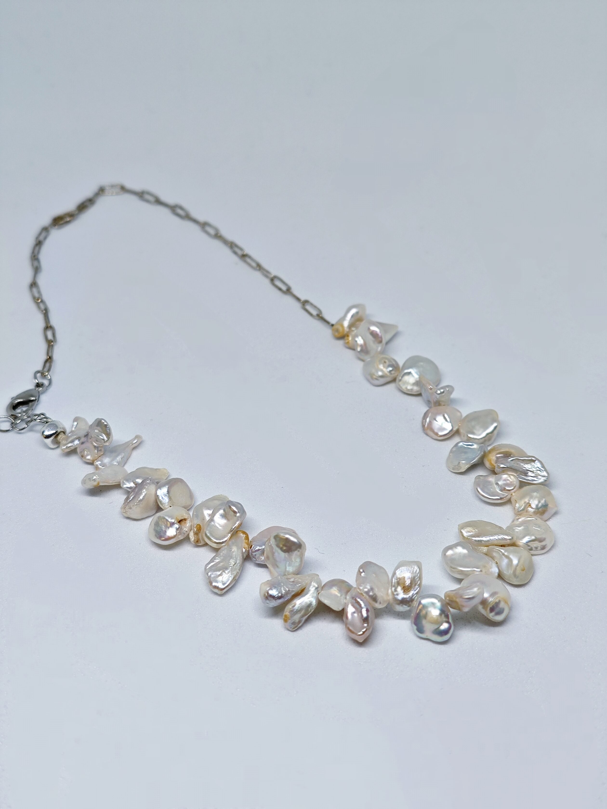 Featuring cultured pearls in irregular shapes and radiant natural luster, it pairs effortlessly with a minimalist metal chain to create striking visual contrast.