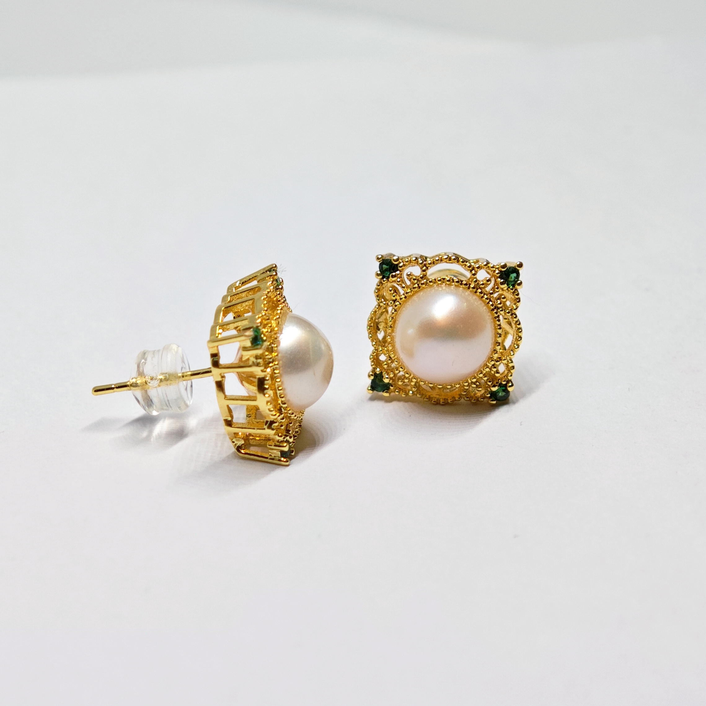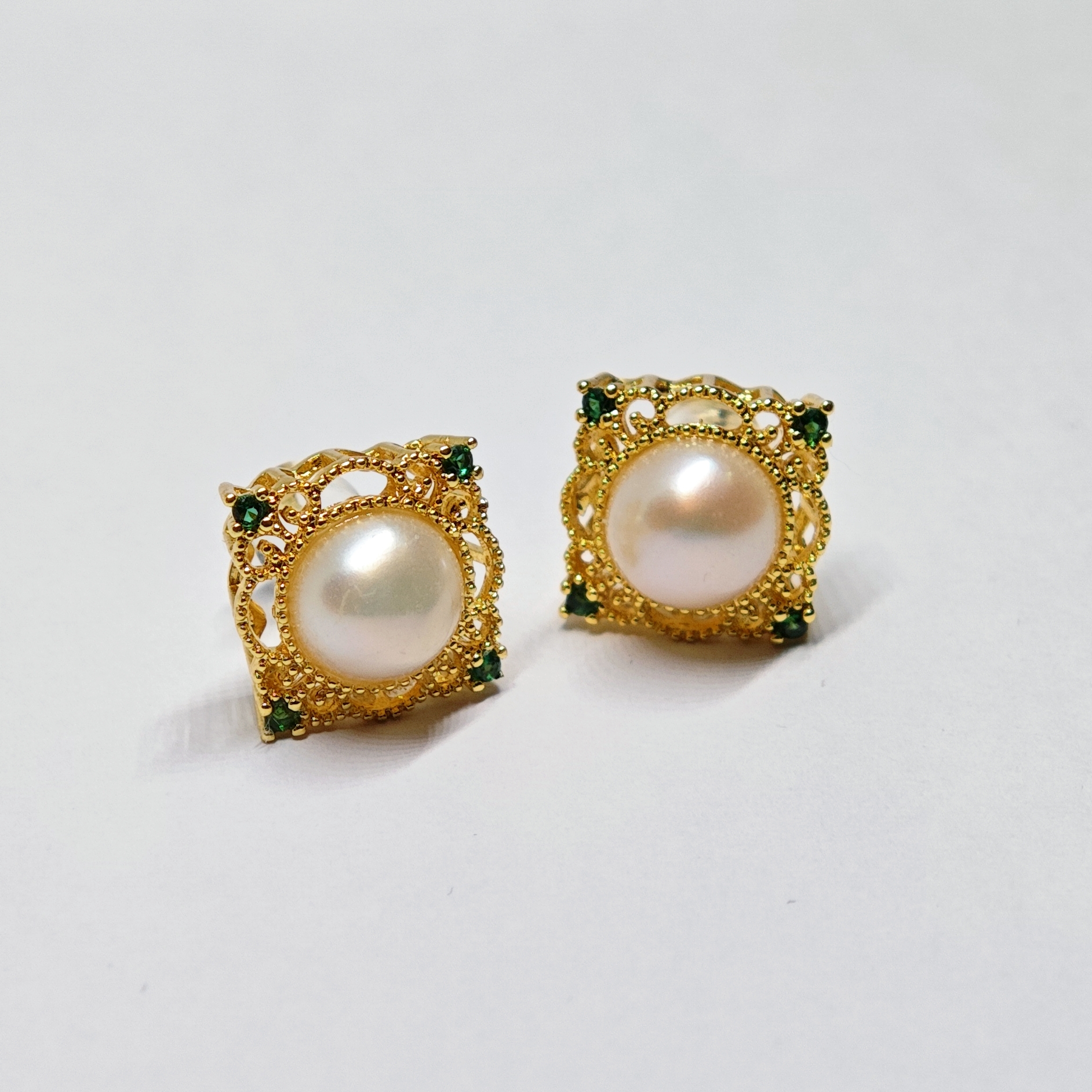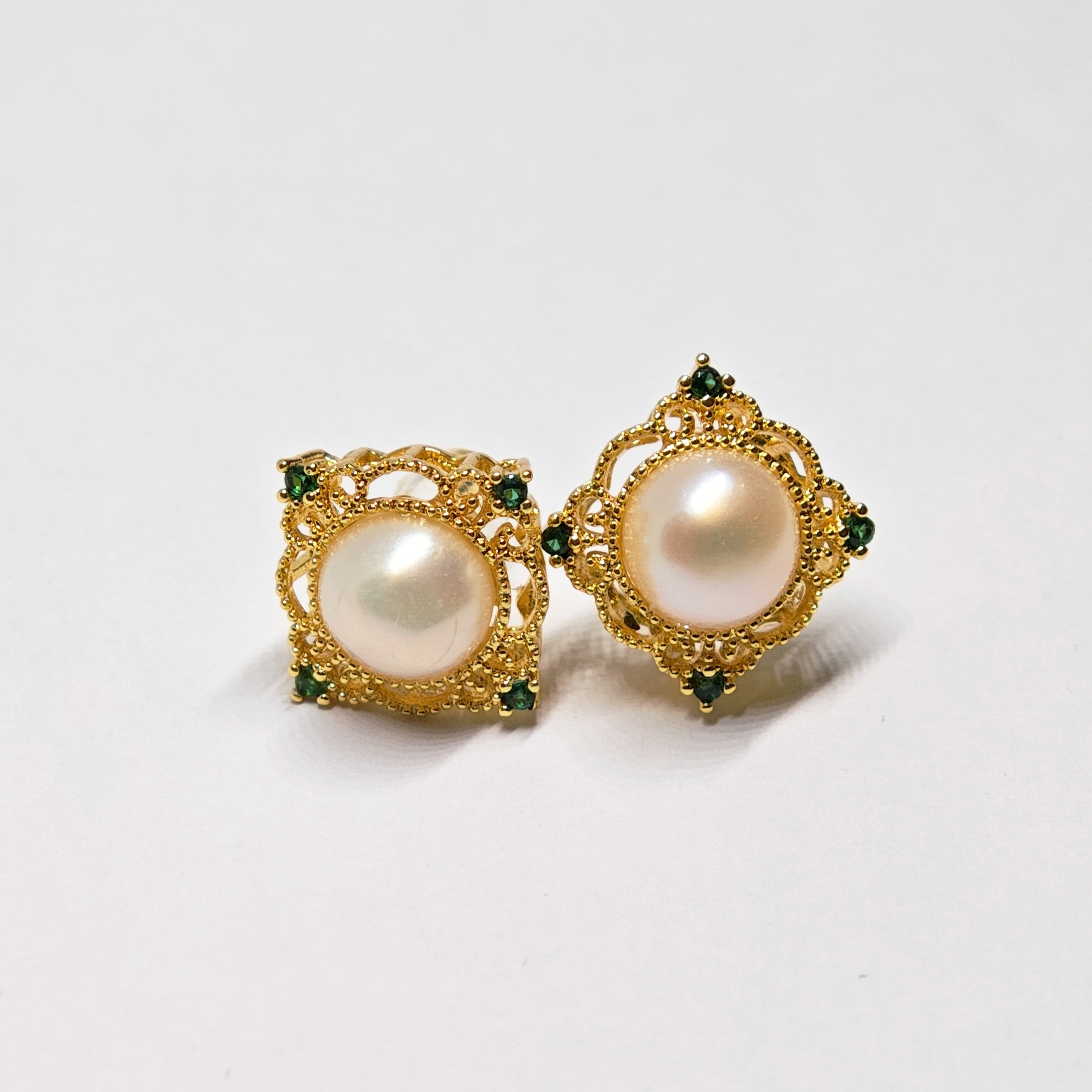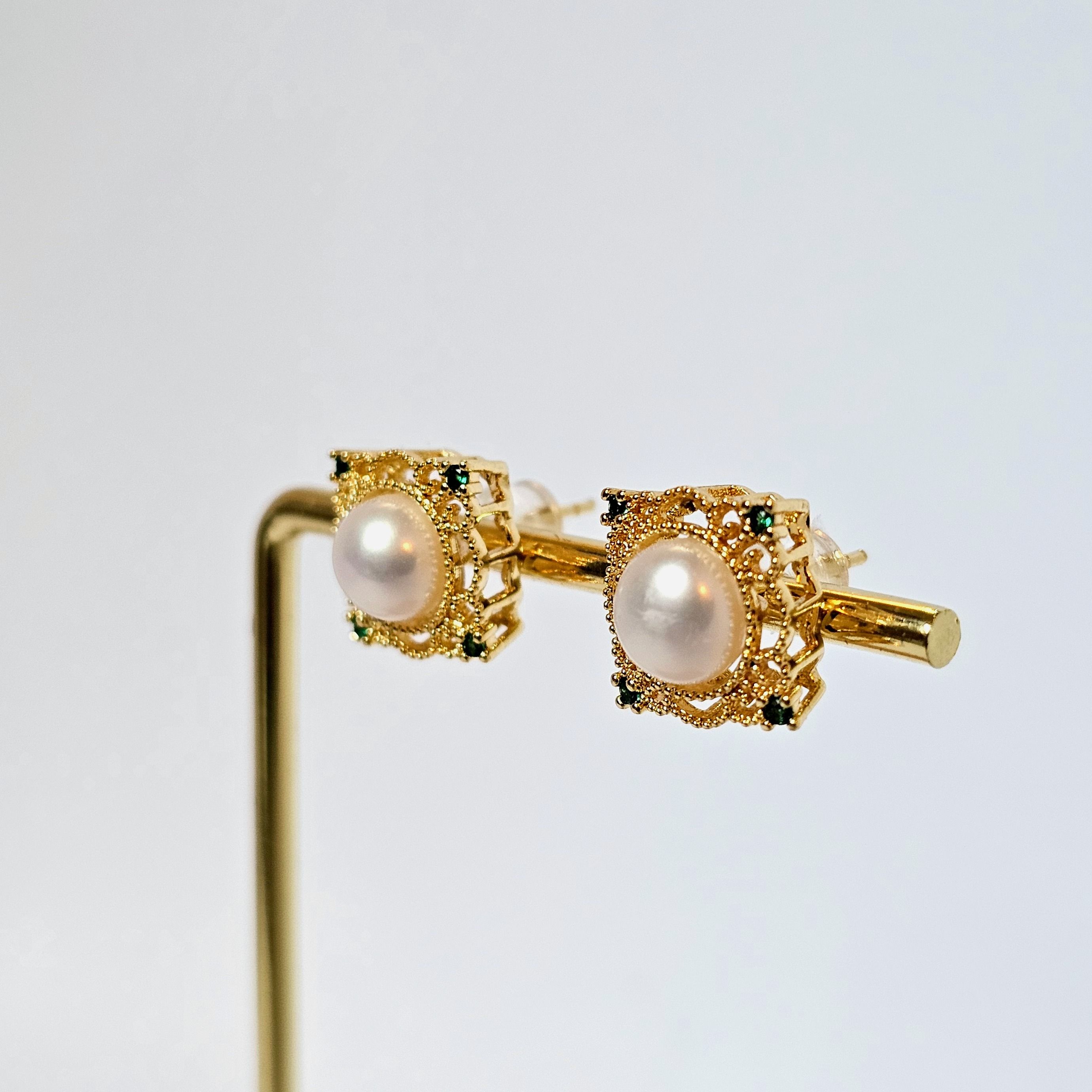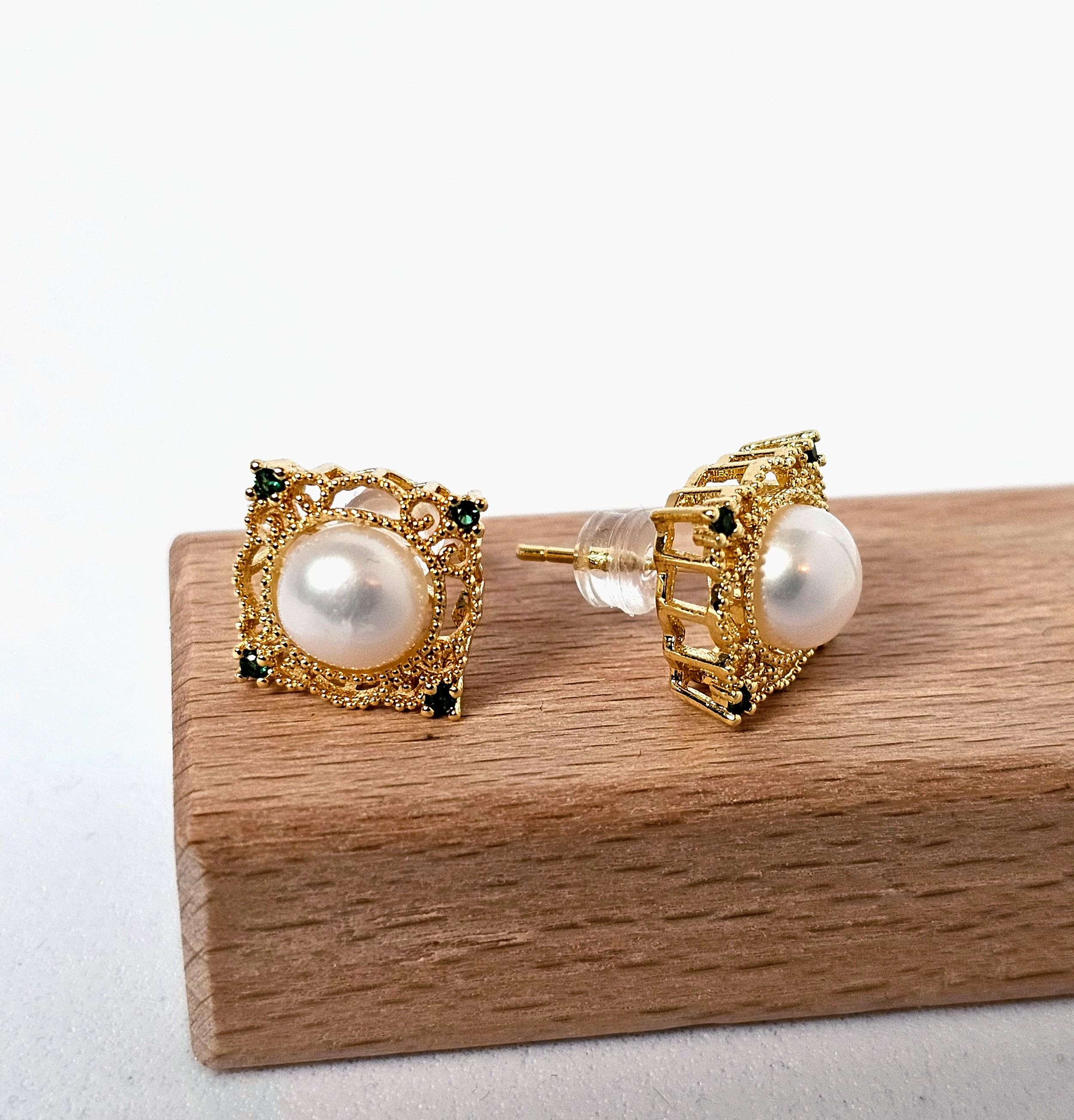 Embark on a journey of luxury with our “Garden of Granada” earrings, a fusion of exquisite green and radiant gold, adorned with pearls that add a touch of sophistication and elegance.