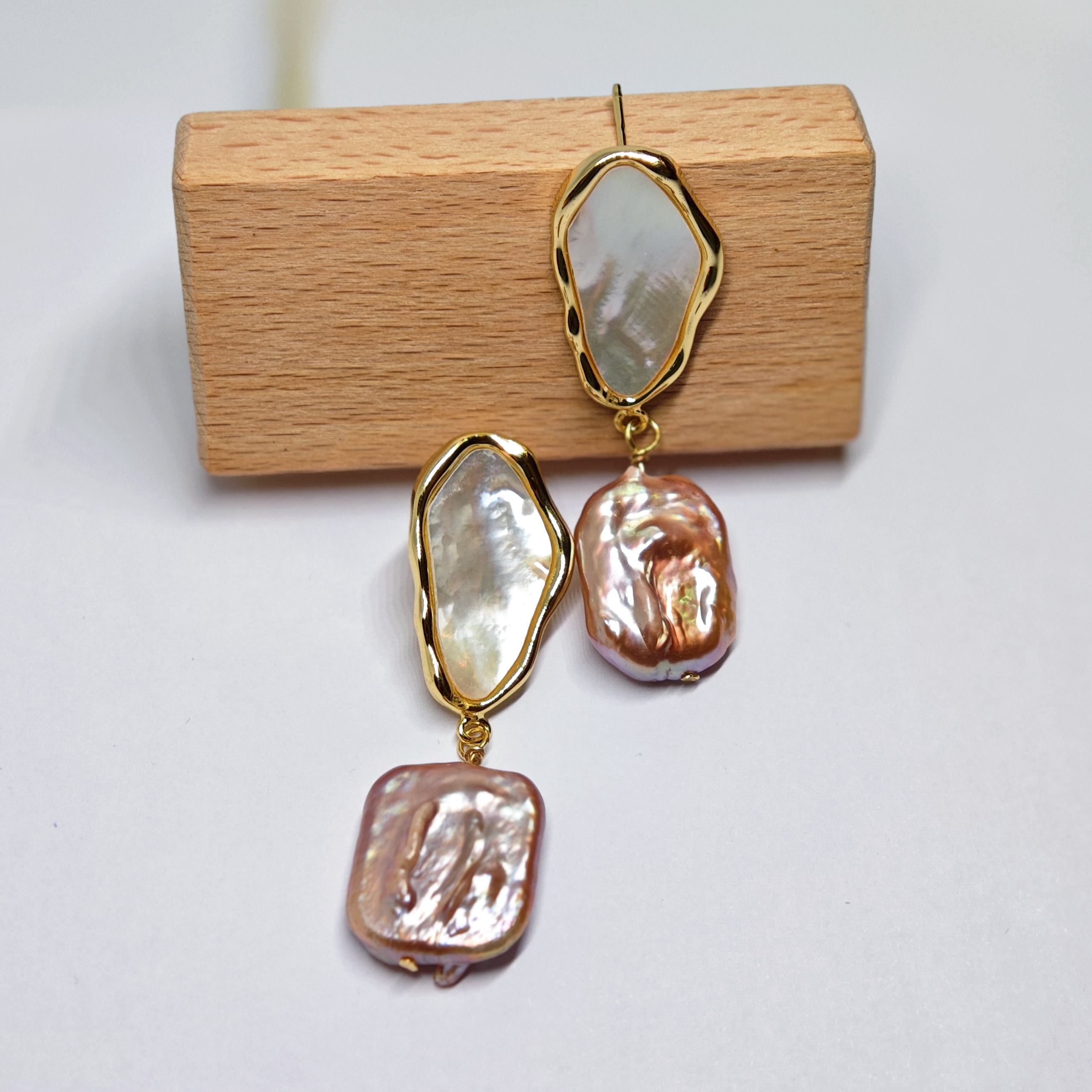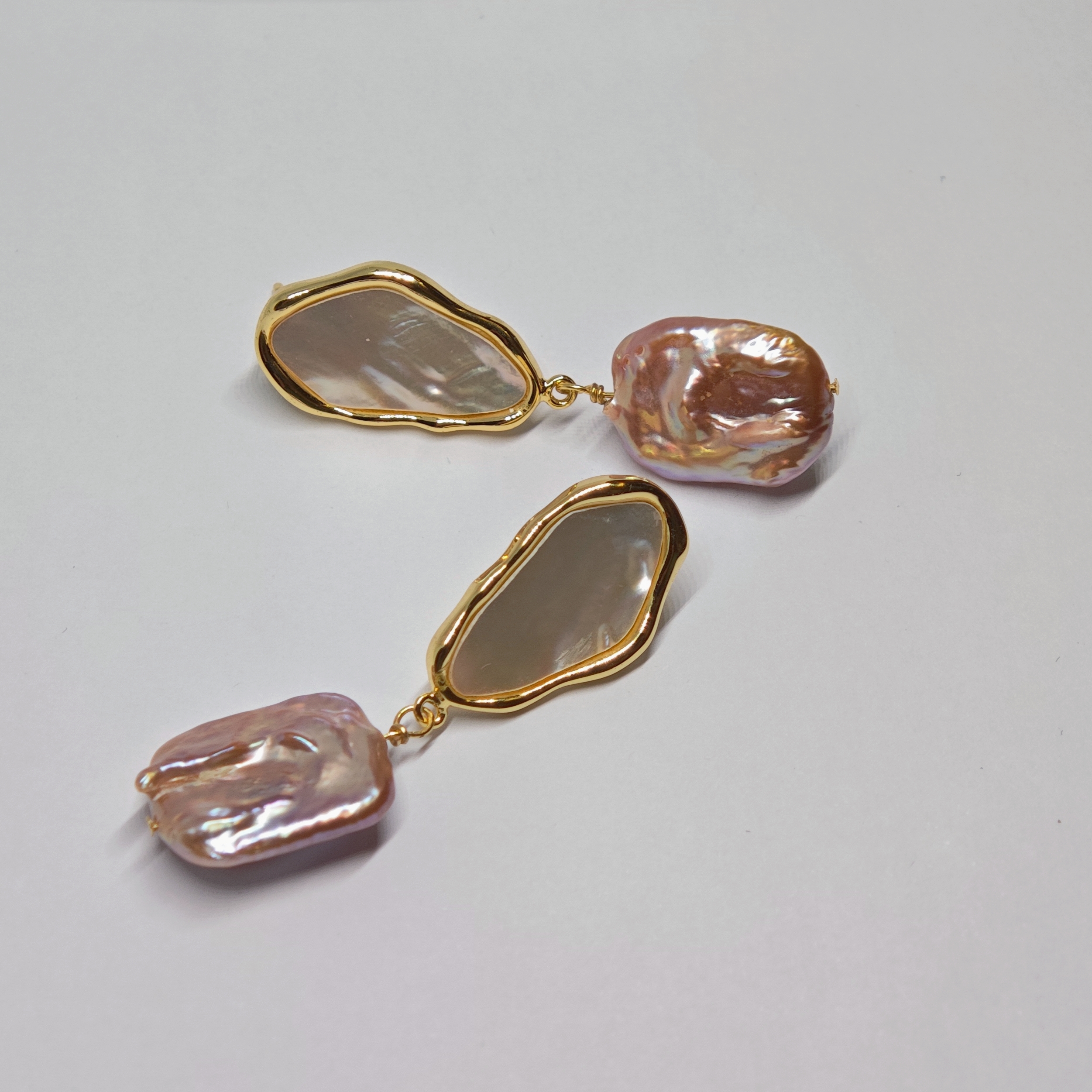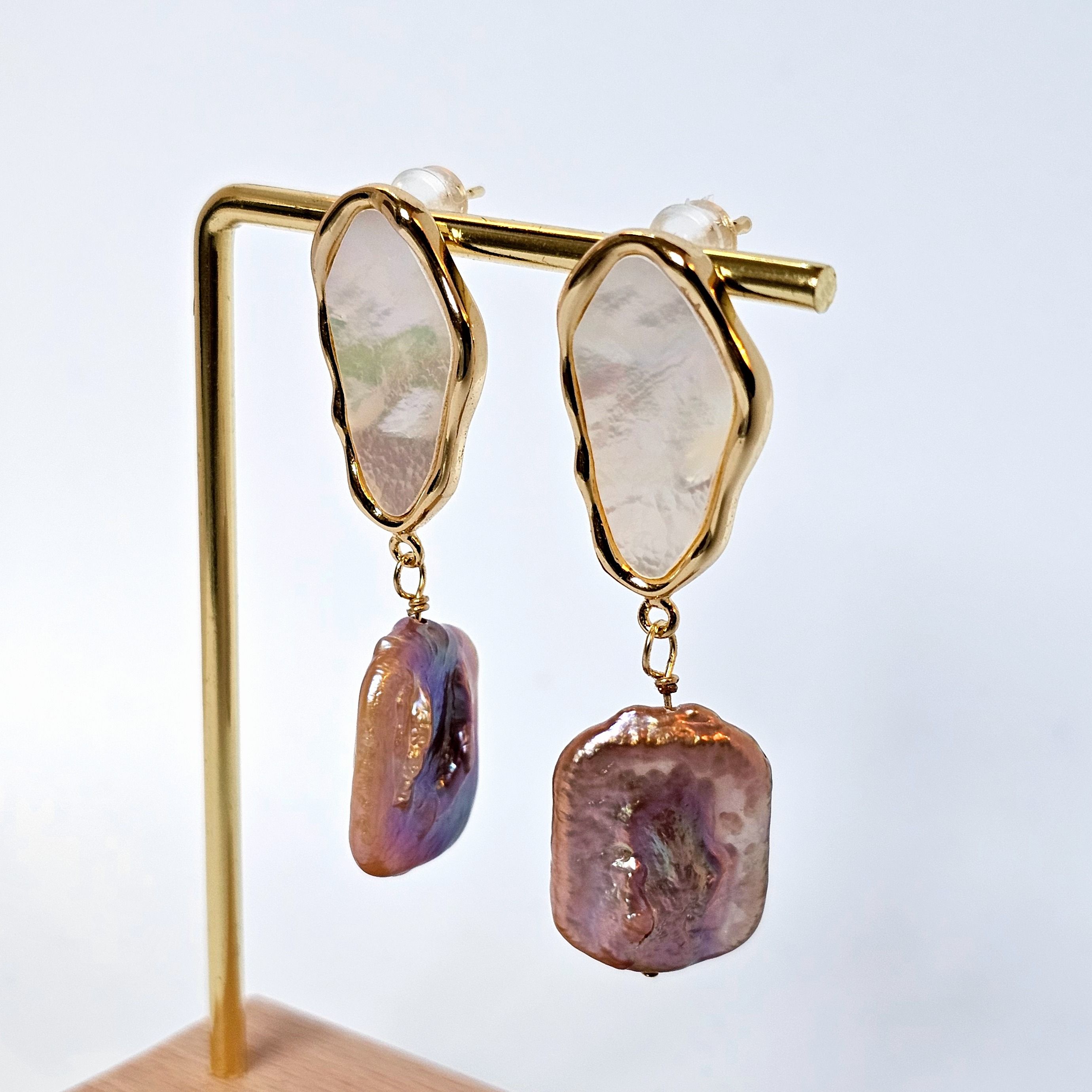 Let the surreal elegance of our earrings transport you to a world where purple baroque pearls and mother-of-pearl, like flashes of time, blend harmoniously with the timeless beauty of nacre.
